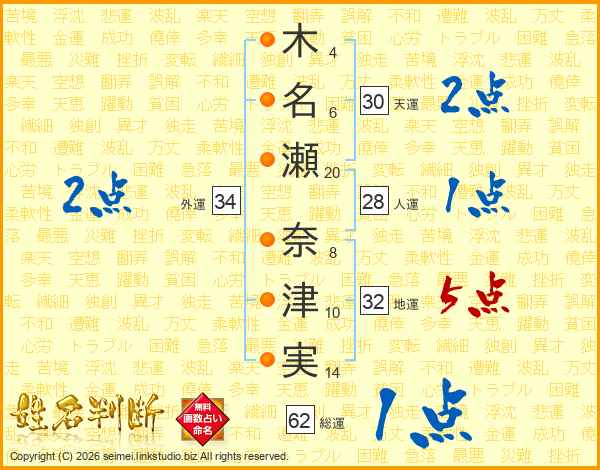 木(4画)名(6画)瀬(20画) 奈(8画)津(10画)実(14画)