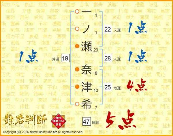 一(1画)ノ(1画)瀬(20画) 奈(8画)津(10画)希(7画)
