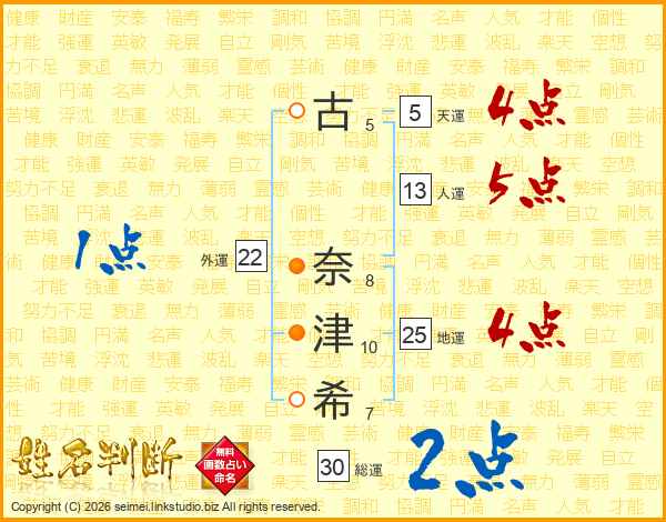 古(5画) 奈(8画)津(10画)希(7画)