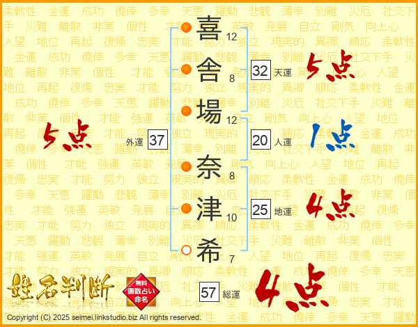 喜(12画)舎(8画)場(12画) 奈(8画)津(10画)希(7画)
