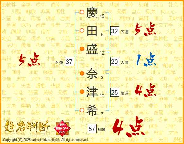 慶(15画)田(5画)盛(12画) 奈(8画)津(10画)希(7画)