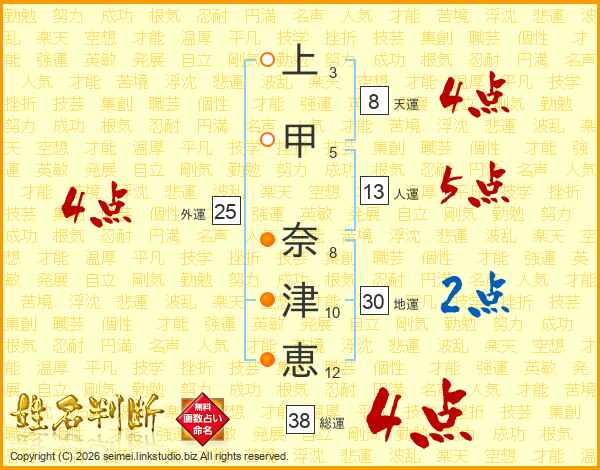 上(3画)甲(5画) 奈(8画)津(10画)恵(12画)