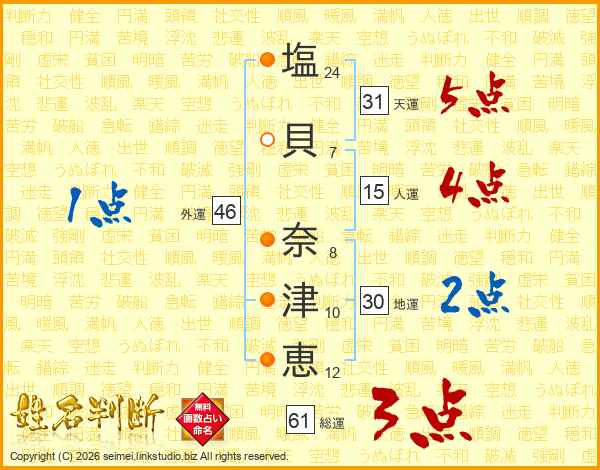 塩(24画)貝(7画) 奈(8画)津(10画)恵(12画)