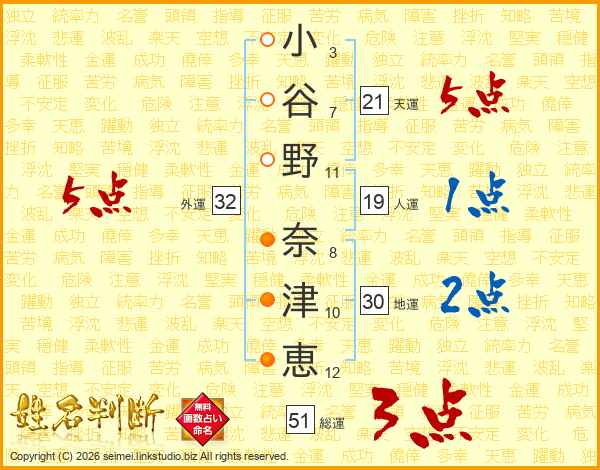 小谷野奈津恵さんの総運は51画の3点!