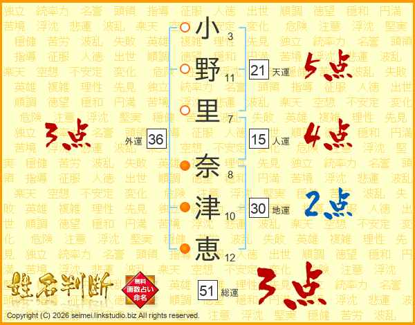 小(3画)野(11画)里(7画) 奈(8画)津(10画)恵(12画)