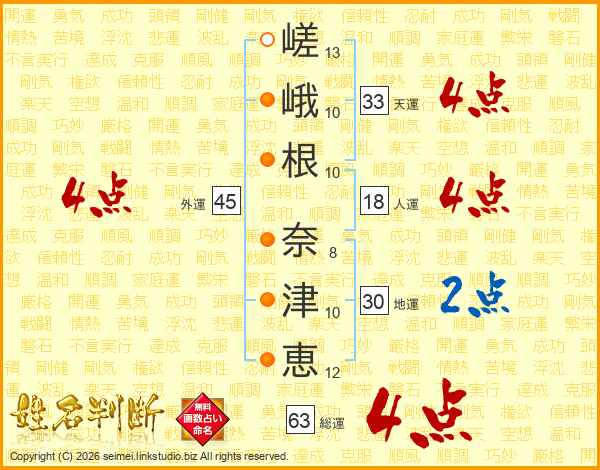 嵯(13画)峨(10画)根(10画) 奈(8画)津(10画)恵(12画)
