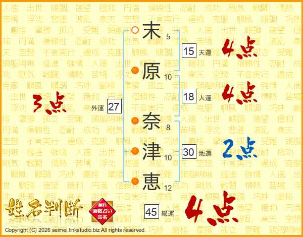 末(5画)原(10画) 奈(8画)津(10画)恵(12画)