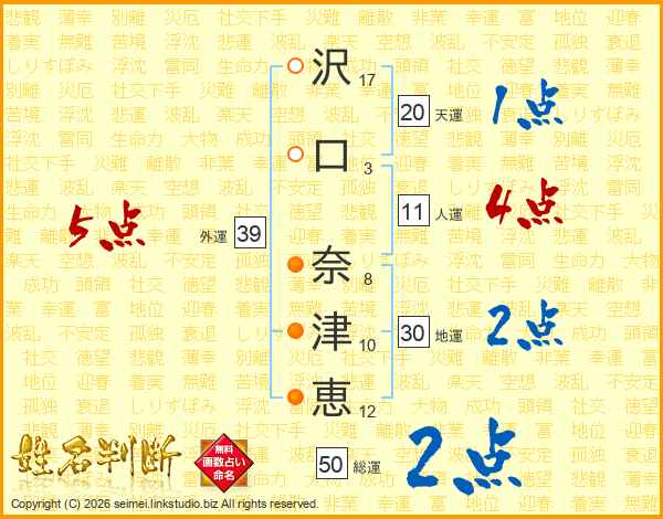 沢(17画)口(3画) 奈(8画)津(10画)恵(12画)