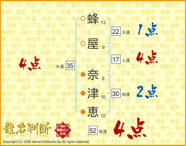 蜂屋奈津恵さんの総運は52画の4点!