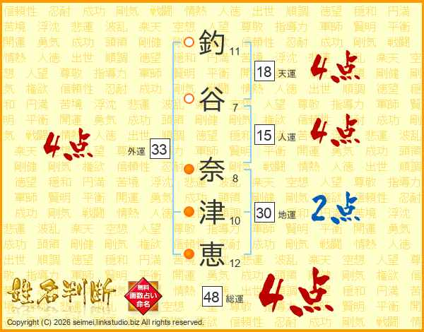 釣(11画)谷(7画) 奈(8画)津(10画)恵(12画)