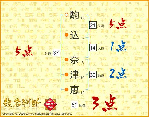 駒(15画)込(6画) 奈(8画)津(10画)恵(12画)