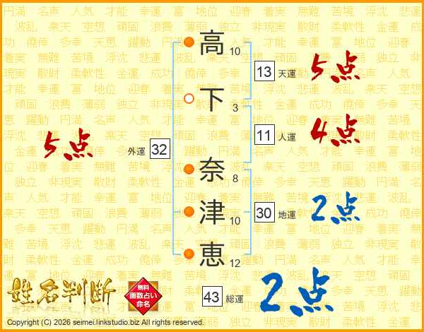 高下奈津恵さんの総運は43画の2点!