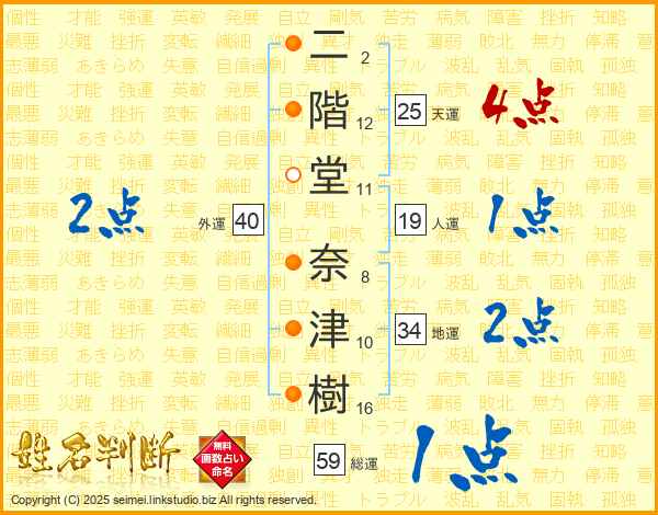 二(2画)階(12画)堂(11画) 奈(8画)津(10画)樹(16画)