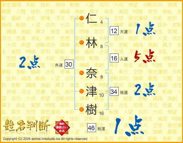 仁(4画)林(8画) 奈(8画)津(10画)樹(16画)