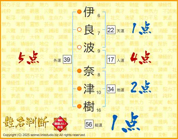 伊(6画)良(7画)波(9画) 奈(8画)津(10画)樹(16画)