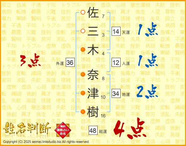 佐(7画)三(3画)木(4画) 奈(8画)津(10画)樹(16画)