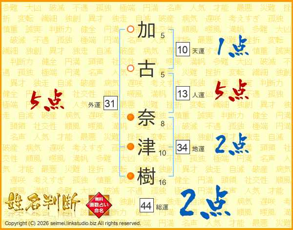 加(5画)古(5画) 奈(8画)津(10画)樹(16画)