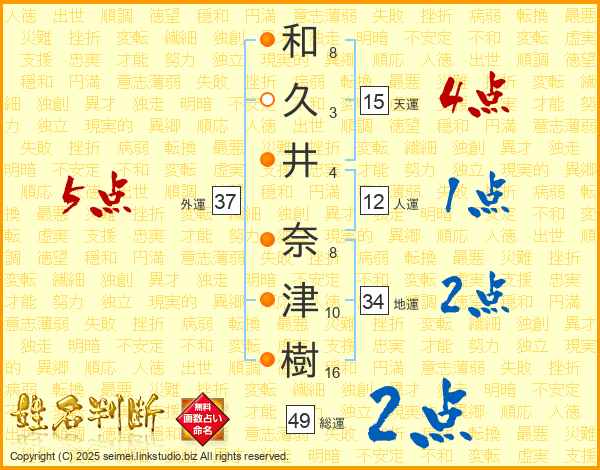 和(8画)久(3画)井(4画) 奈(8画)津(10画)樹(16画)
