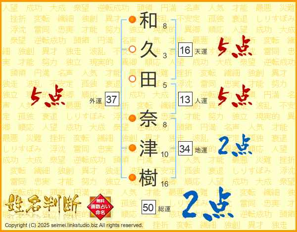 和(8画)久(3画)田(5画) 奈(8画)津(10画)樹(16画)