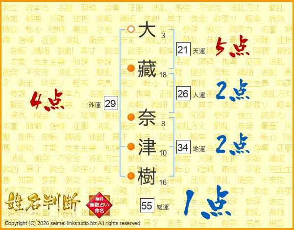 大(3画)藏(18画) 奈(8画)津(10画)樹(16画)