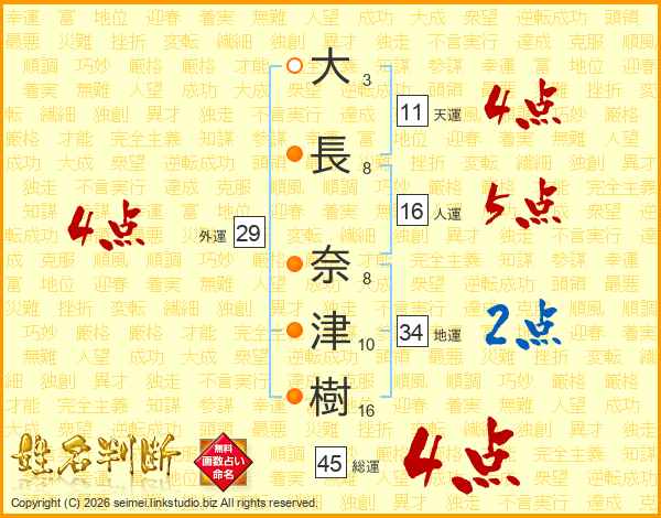 大(3画)長(8画) 奈(8画)津(10画)樹(16画)