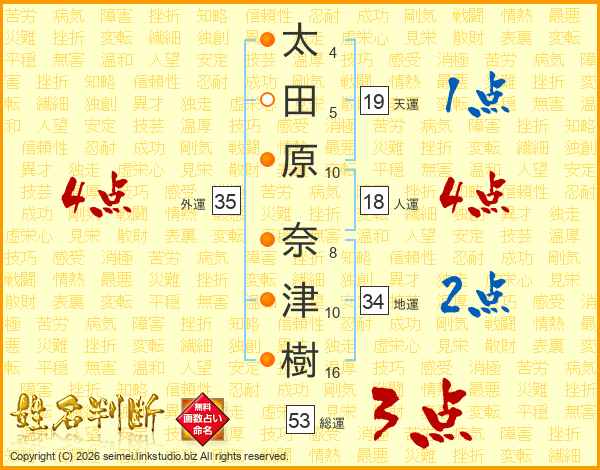 太(4画)田(5画)原(10画) 奈(8画)津(10画)樹(16画)