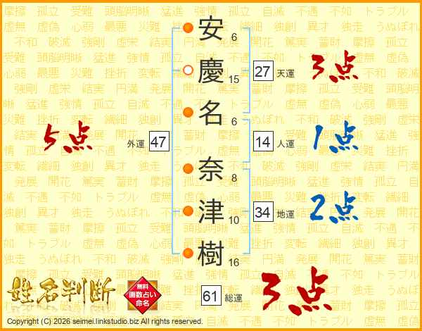 安(6画)慶(15画)名(6画) 奈(8画)津(10画)樹(16画)