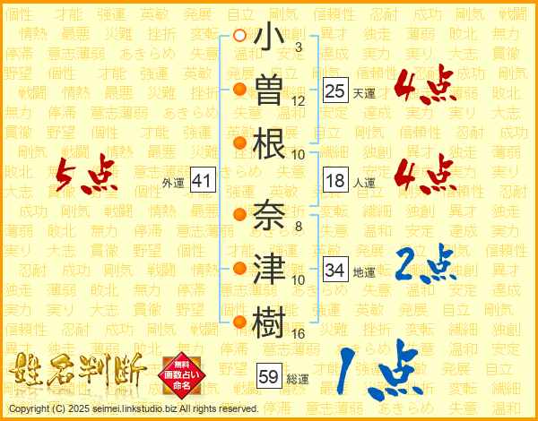 小(3画)曽(12画)根(10画) 奈(8画)津(10画)樹(16画)