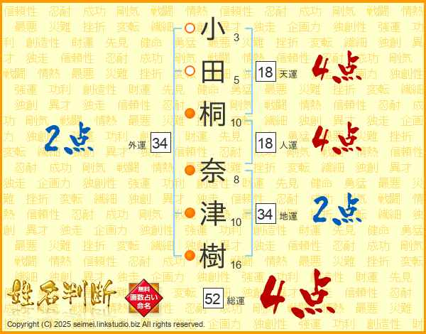 小(3画)田(5画)桐(10画) 奈(8画)津(10画)樹(16画)