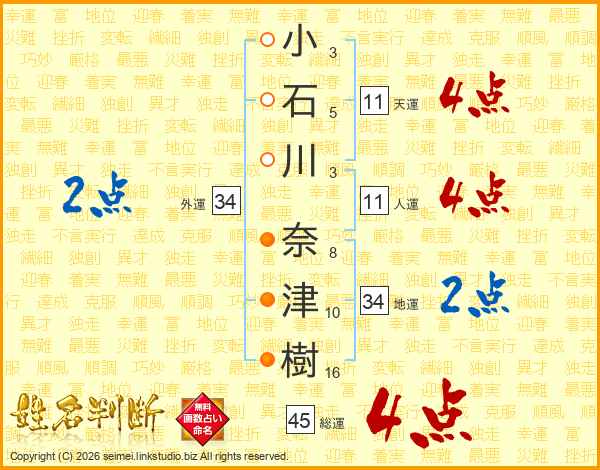 小(3画)石(5画)川(3画) 奈(8画)津(10画)樹(16画)