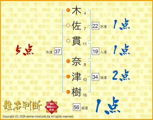 木(4画)佐(7画)貫(11画) 奈(8画)津(10画)樹(16画)