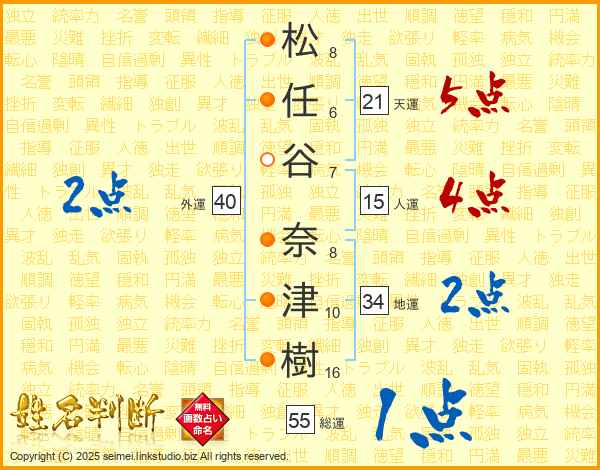 松(8画)任(6画)谷(7画) 奈(8画)津(10画)樹(16画)
