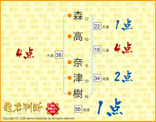 森(12画)高(10画) 奈(8画)津(10画)樹(16画)