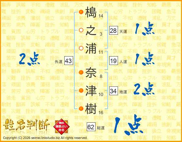 槝(14画)之(3画)浦(11画) 奈(8画)津(10画)樹(16画)