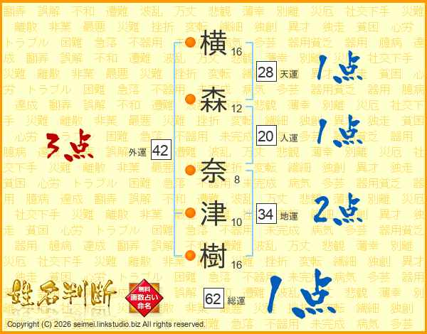 横(16画)森(12画) 奈(8画)津(10画)樹(16画)