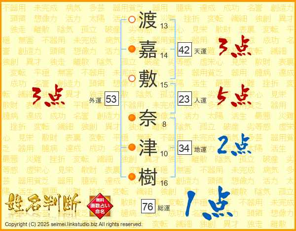 渡(13画)嘉(14画)敷(15画) 奈(8画)津(10画)樹(16画)