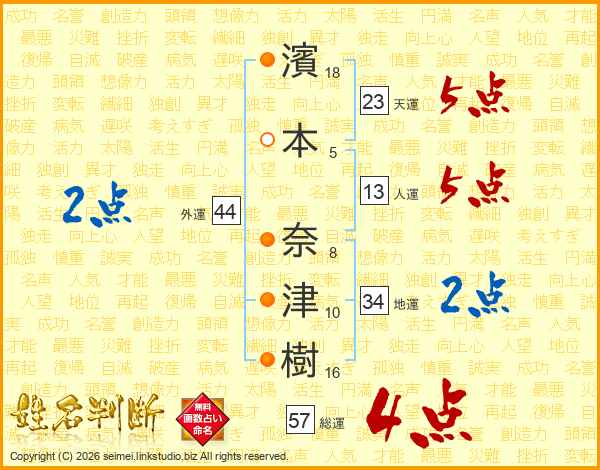 濱(18画)本(5画) 奈(8画)津(10画)樹(16画)