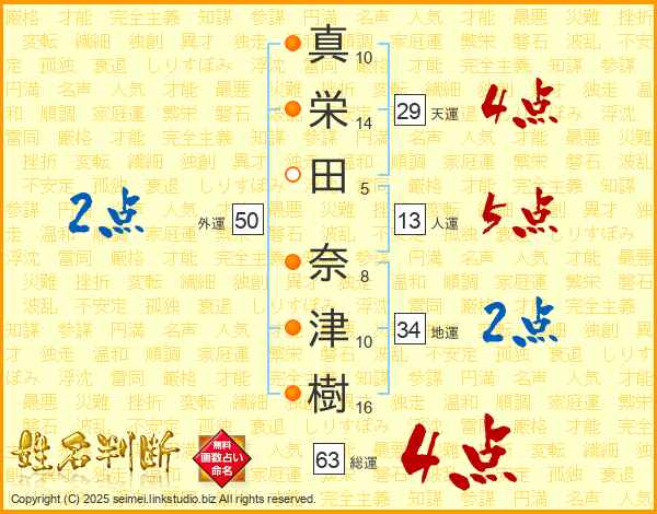 真(10画)栄(14画)田(5画) 奈(8画)津(10画)樹(16画)