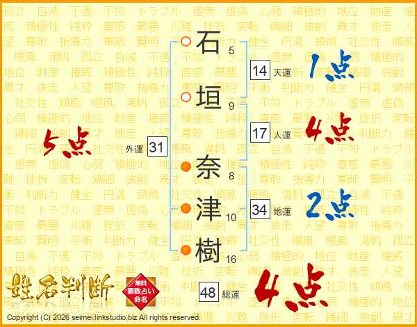 石(5画)垣(9画) 奈(8画)津(10画)樹(16画)
