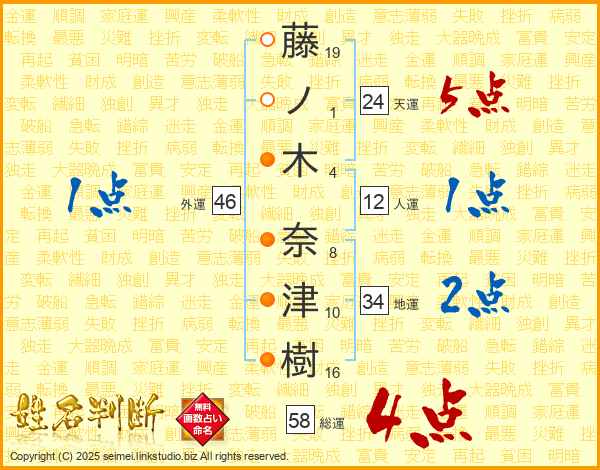 藤(19画)ノ(1画)木(4画) 奈(8画)津(10画)樹(16画)