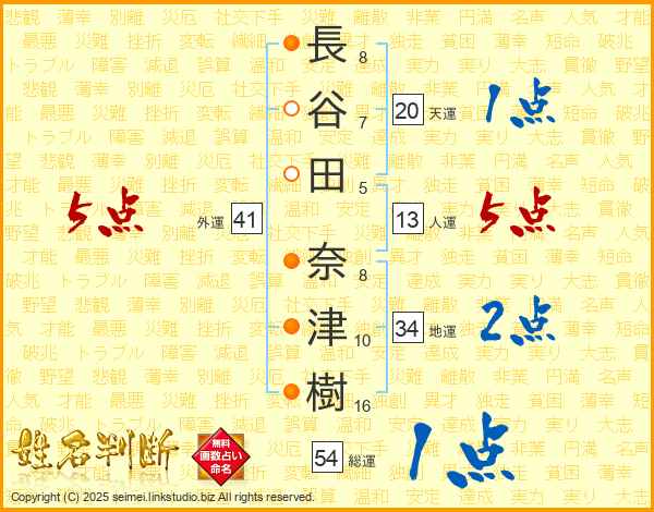 長(8画)谷(7画)田(5画) 奈(8画)津(10画)樹(16画)