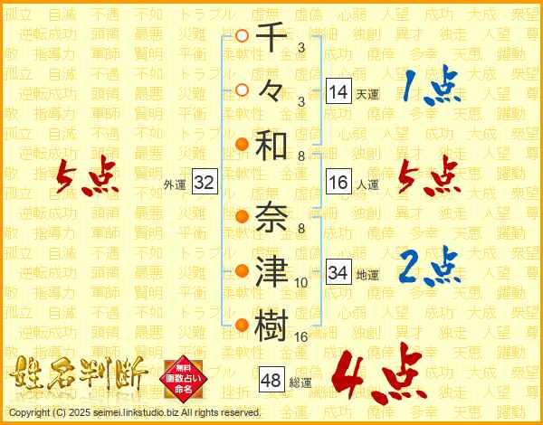 千(3画)々(3画)和(8画) 奈(8画)津(10画)樹(16画)