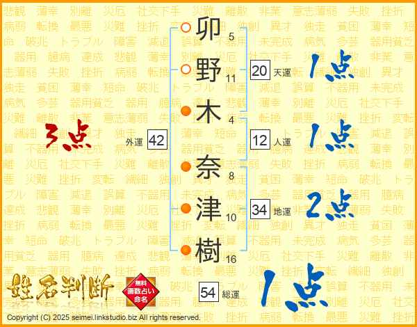 卯(5画)野(11画)木(4画)  奈(8画)津(10画)樹(16画)