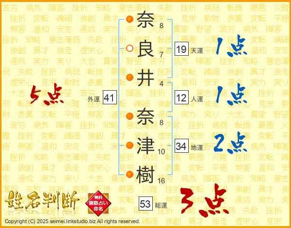 奈(8画)良(7画)井(4画) 奈(8画)津(10画)樹(16画)