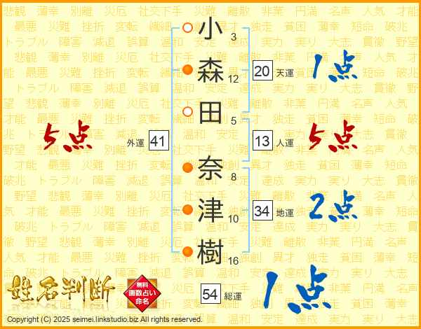 小(3画)森(12画)田(5画) 奈(8画)津(10画)樹(16画)