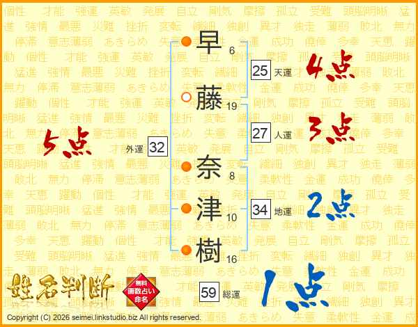 早(6画)藤(19画) 奈(8画)津(10画)樹(16画)