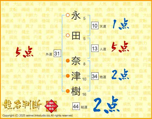 永(5画)田(5画) 奈(8画)津(10画)樹(16画)