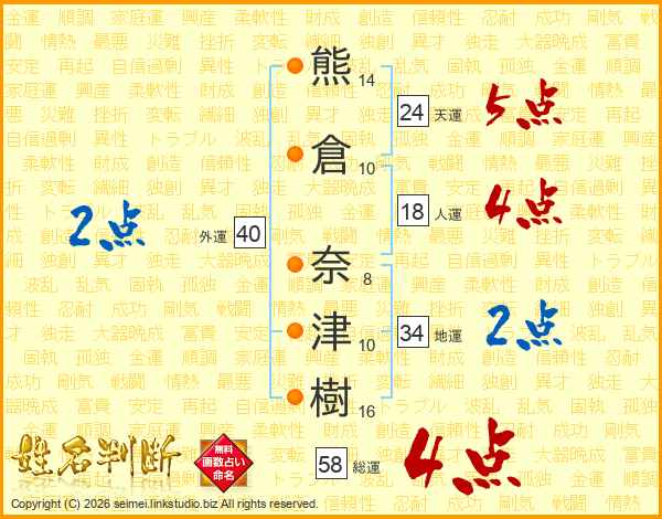 熊(14画)倉(10画) 奈(8画)津(10画)樹(16画)