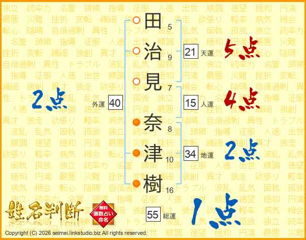 田(5画)治(9画)見(7画) 奈(8画)津(10画)樹(16画)