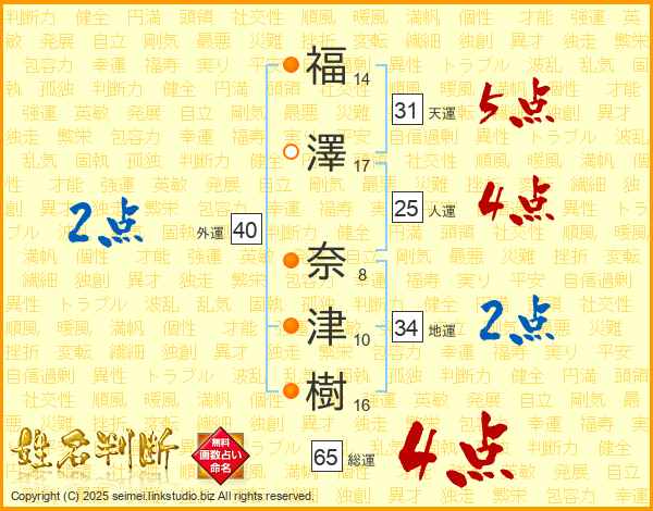 福(14画)澤(17画) 奈(8画)津(10画)樹(16画)